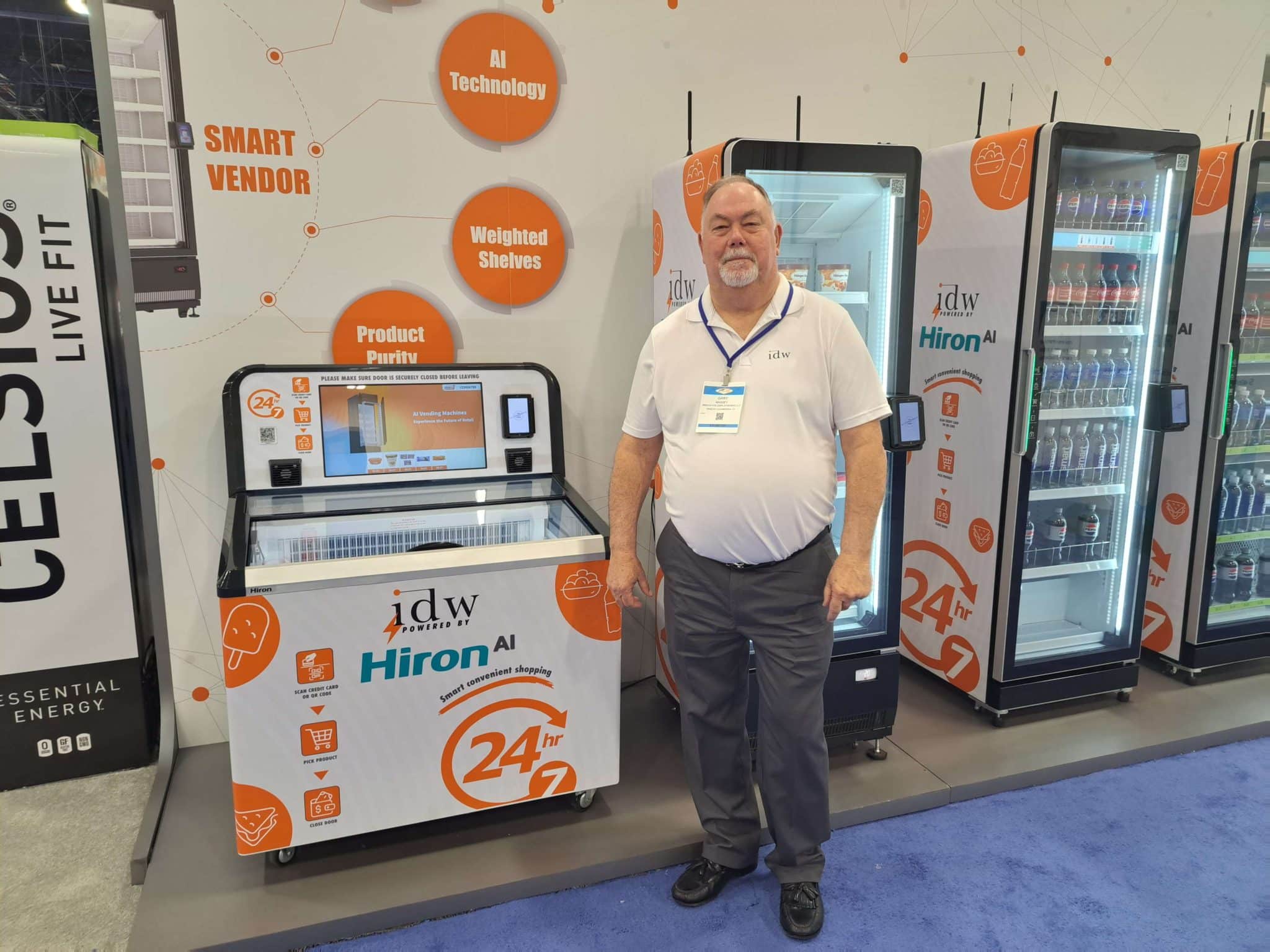 - A man in a white polo shirt and dark pants stands before AI-enabled vending machines at Vending Automation at NAMA, showcasing orange and white branding. Signs highlight AI technology, weighted shelves, and 24-hour availability.
