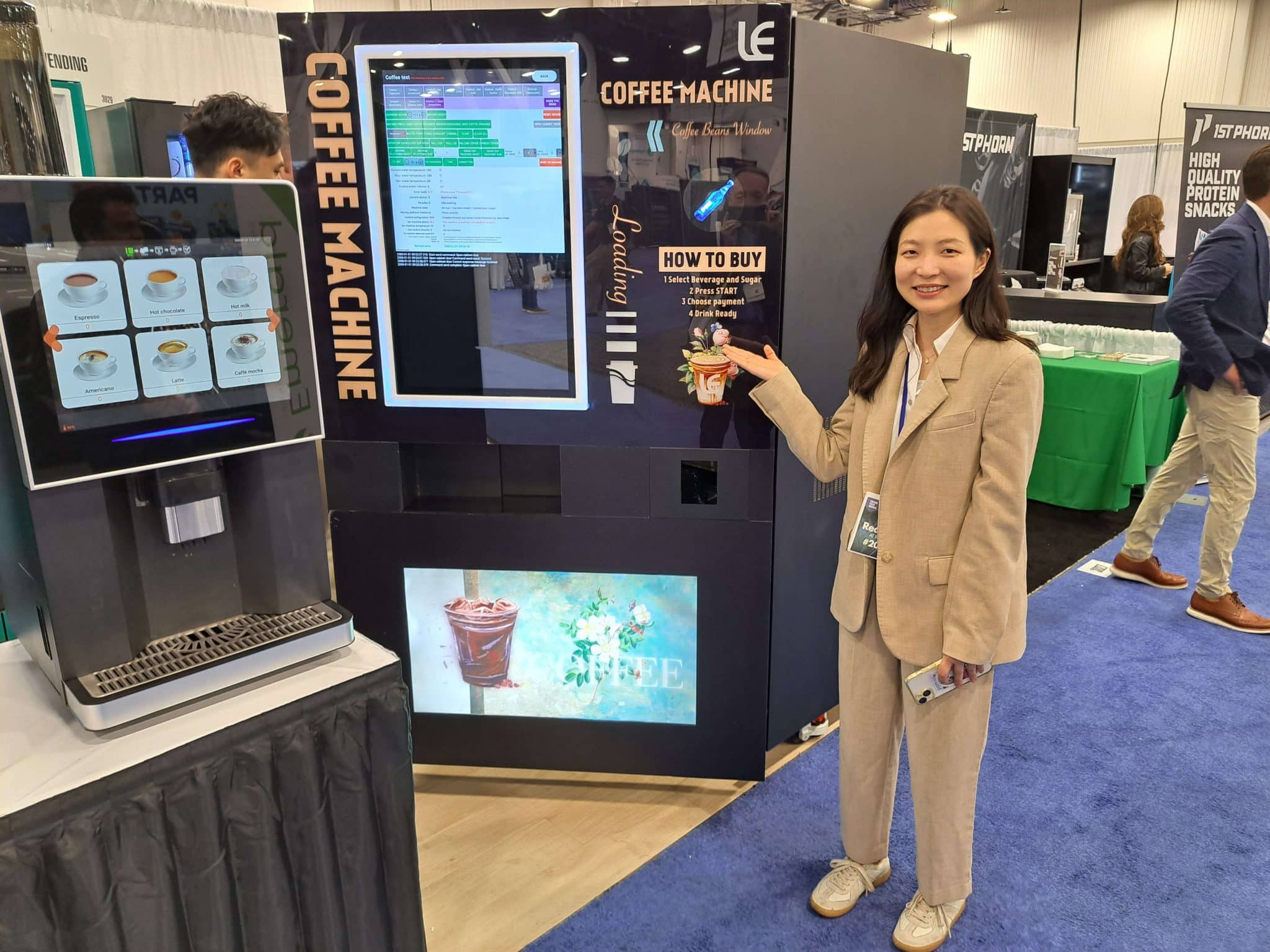 - A woman in a beige suit smiles and points at a large self-serve coffee machine with touchscreen menus, showcasing Vending Automation at NAMA. A nearby screen displays coffee options while other booths are visible in the background.