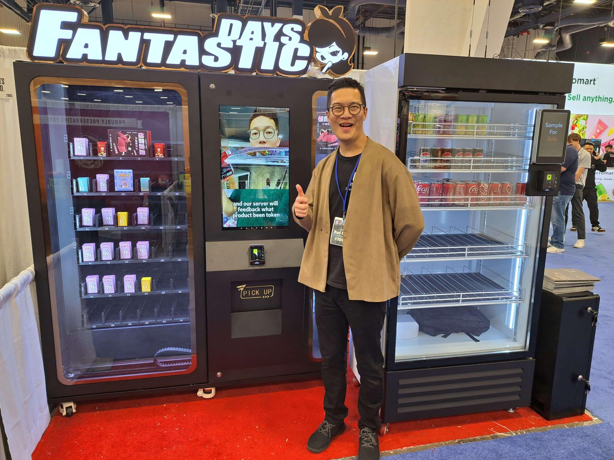 - A man stands smiling and giving a thumbs up next to two vending machines labeled Fantastic Days, showcasing Vending Automation at NAMA. The left machine holds various products, while the right is mostly empty except for a few items.