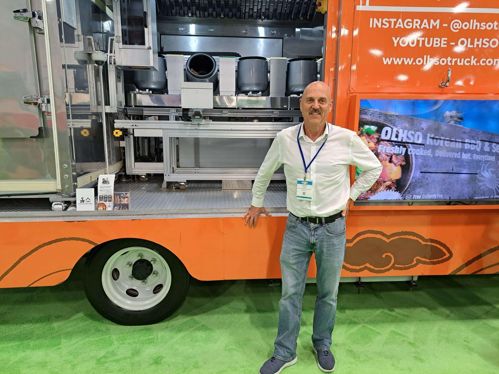 - A man in a white shirt and jeans stands next to an orange food truck with vending automation at NAMA, featuring a green carpeted floor. Part of the truck’s interior machinery and a tire are visible. The image is upside down.