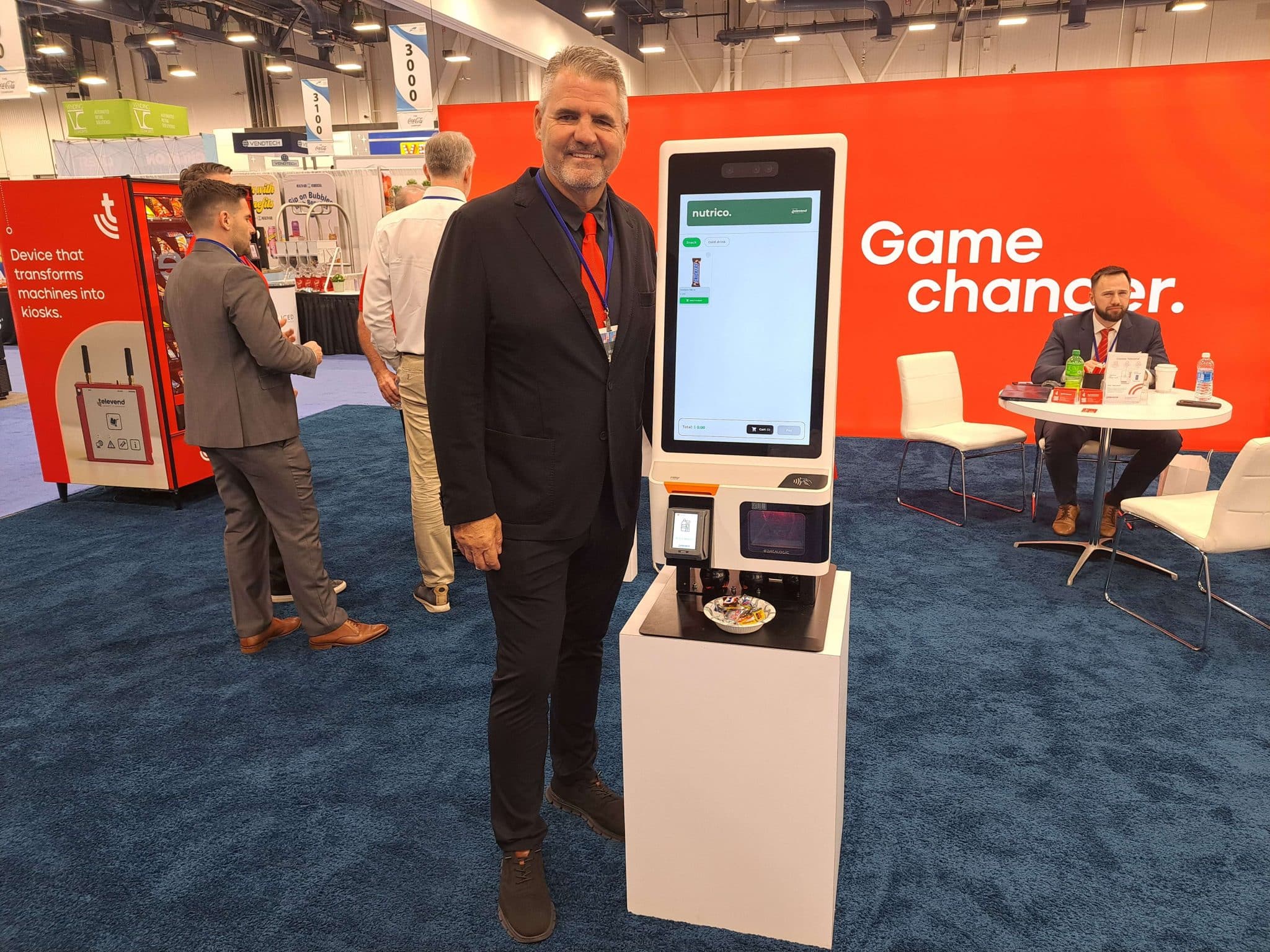 - A man in a suit stands beside a self-service kiosk at a trade show, highlighting Vending Automation at NAMA. Behind him, people converse near booths with displays and a red wall featuring the words Game changer. in white text.