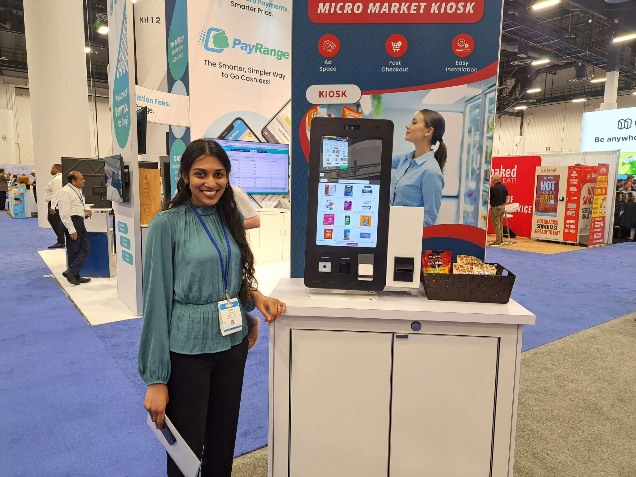 - A woman stands smiling next to a self-service micro market kiosk display showcasing Vending Automation at NAMA, with informational booths and attendees visible in the background.