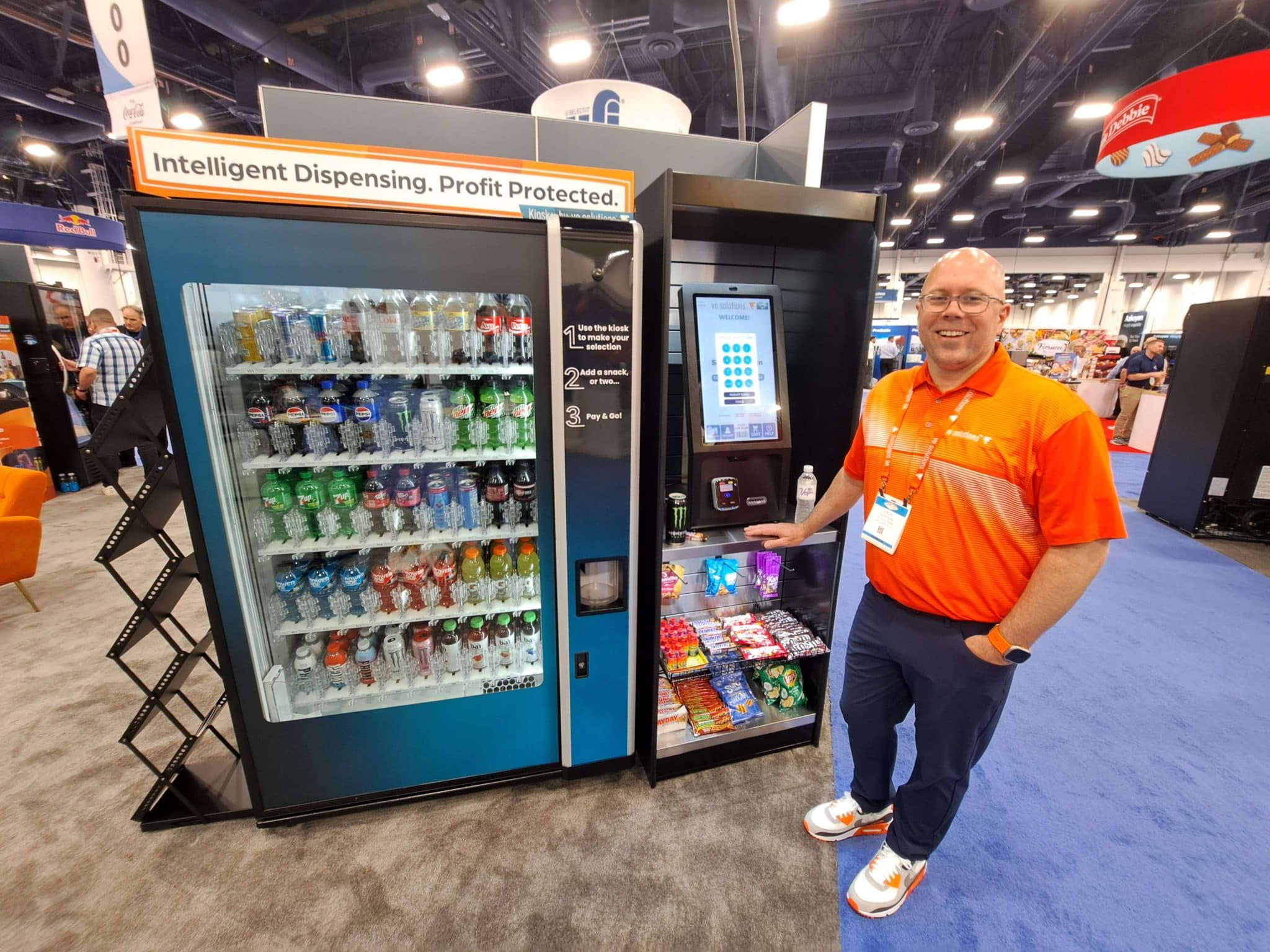 - A smiling man in an orange shirt stands next to a vending machine filled with drinks and snacks at a trade show, showcasing Vending Automation at NAMA. A sign above the machine reads, Intelligent Dispensing. Profit Protected.