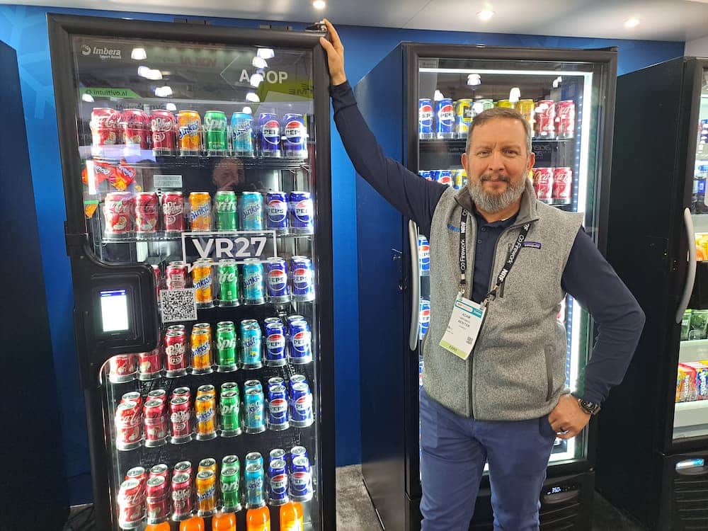 - Adam Antoniou presents the Imbera VR27 Intuitivo self-service cooler merchandiser at the Aeritek Global Holdings exhibit.