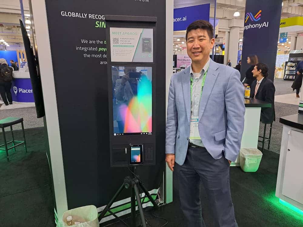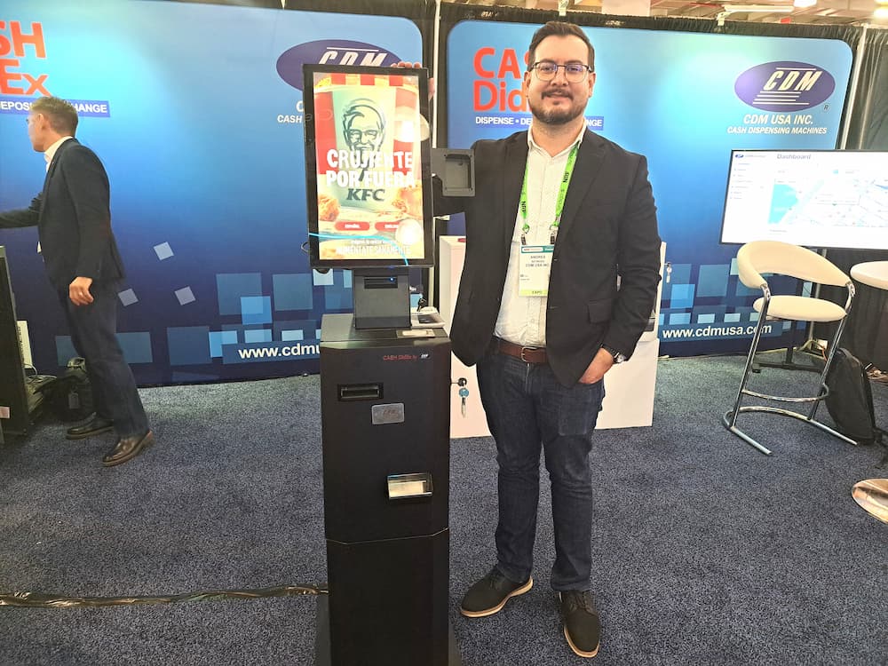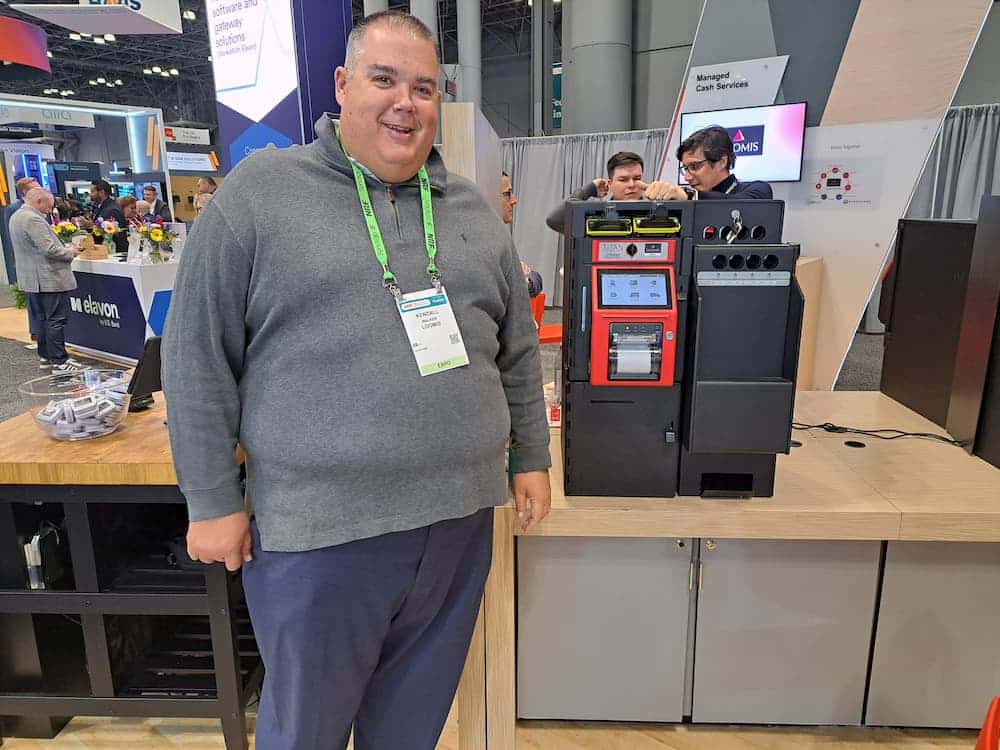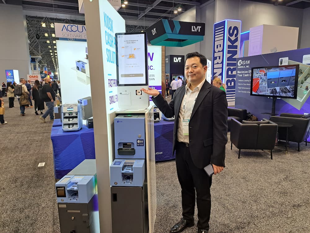 - Daniel Ha introduces the KR10 cash recycling kiosk at the Kisan America Inc. exhibit.