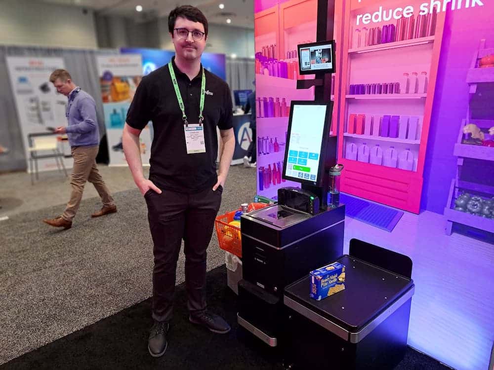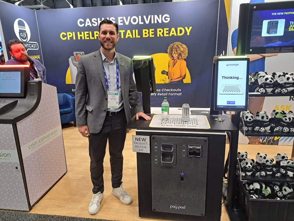 - Jacob Blair presents the integration of the Mashgin AI powered self checkout with the CPI Paypod at the Crane Payment Innovations exhibit.