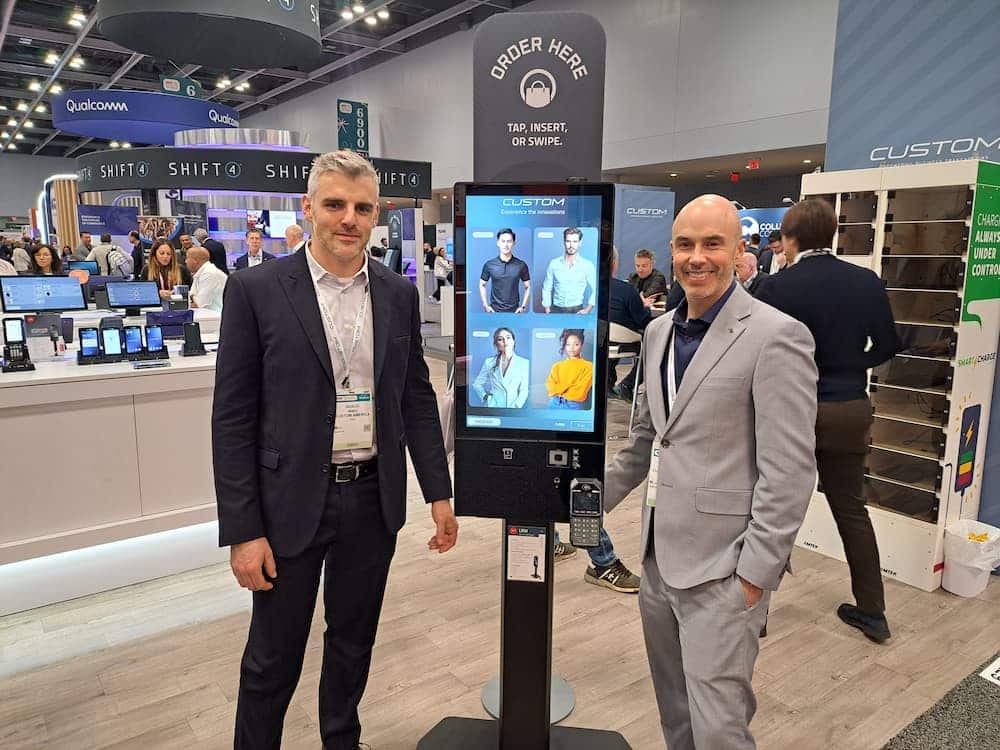 - Giulio Mineo and Jeremy Lemcke demonstrate the Link kiosk at the Custom America Inc. exhibit.