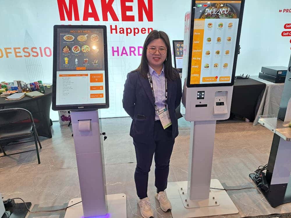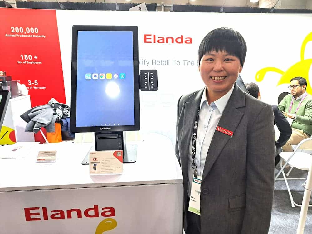 - Judy Lu presents the K21 self-order kiosk at the Elanda exhibit.