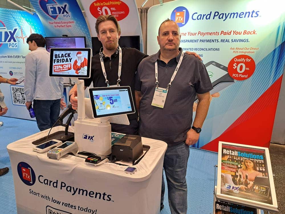 - Patrick Smith and Dino Harba demonstrate a POS hardware bundle at the FTx POS exhibit.