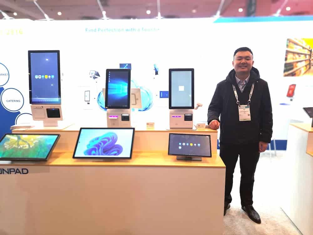 - Wei Li presents the Funpad retail self-checkout kiosks.
