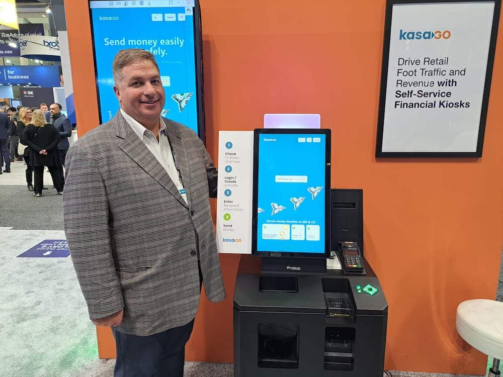 - Michael Stocker introduces the kasaGO retail financial service kiosk at the Glory Global Solutions exhibit.