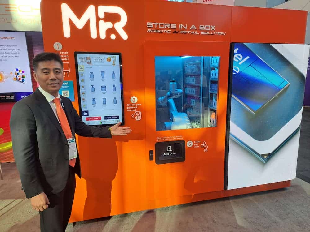 - Nigel Tsui presents the Unistop Tech robotic store at the Intel exhibit.