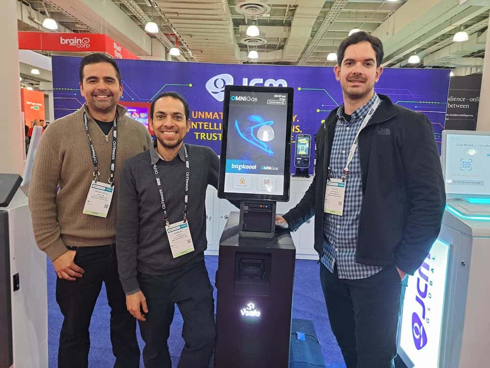 - Francisco Hincapie, Samuel Quiroz and Aldo Coronado present cash handling kiosks at the JCM Commerce Mechatronics exhibit.