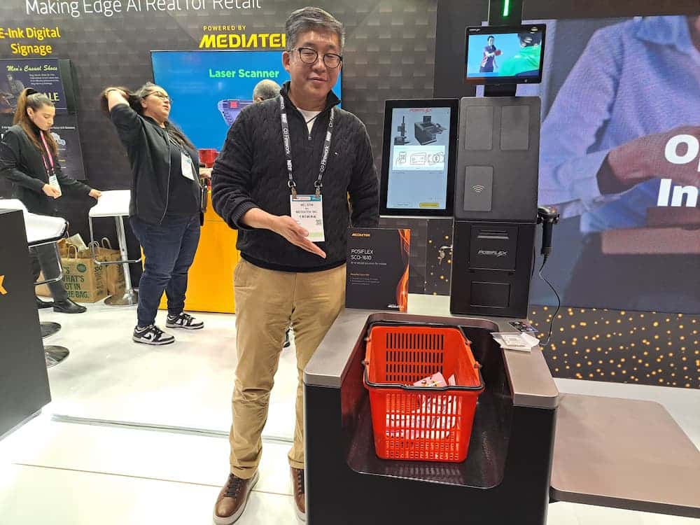 - Nelson Wu presents the Posiflex HK 1610 self checkout kiosk at the MediaTek exhibit.
