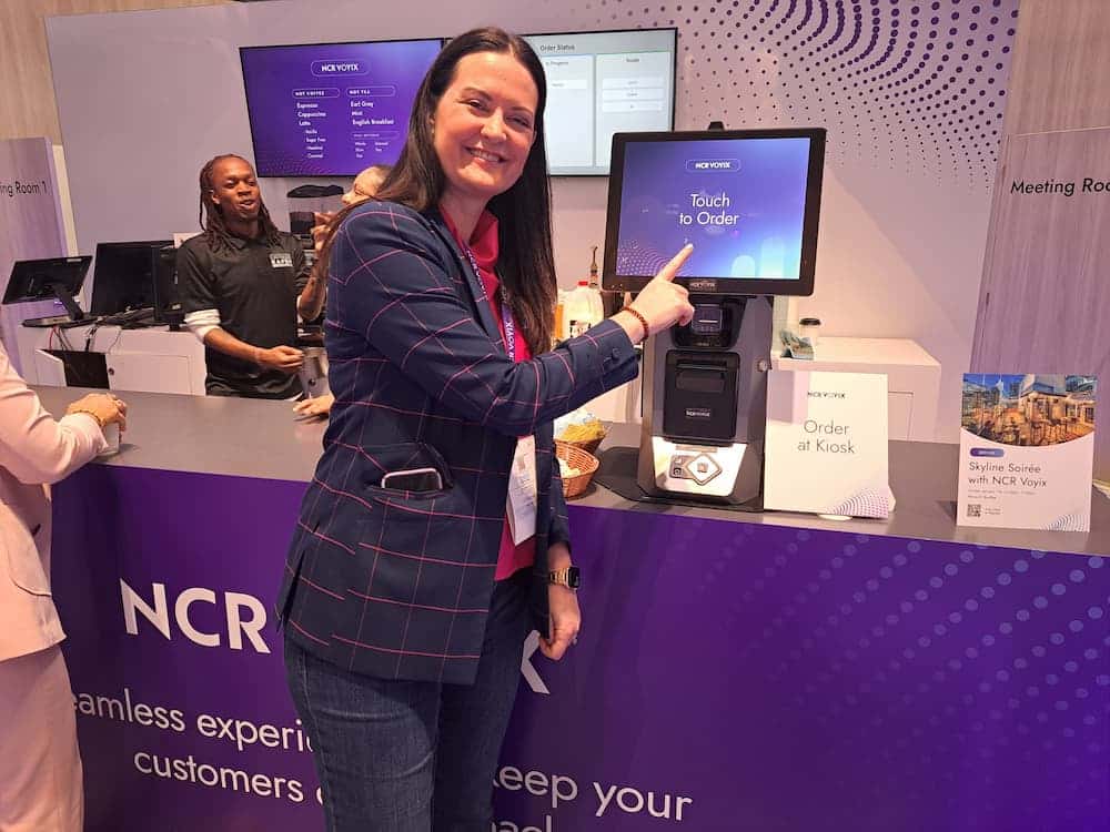 - Jessica Bryant introduces a self checkout kiosk at the NCR Voyix exhibit.