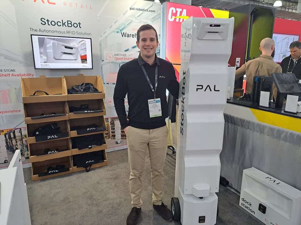 - Alex Font Ibanez demonstrates the StockBot inventory control robot at the PAL Robotics exhibit.