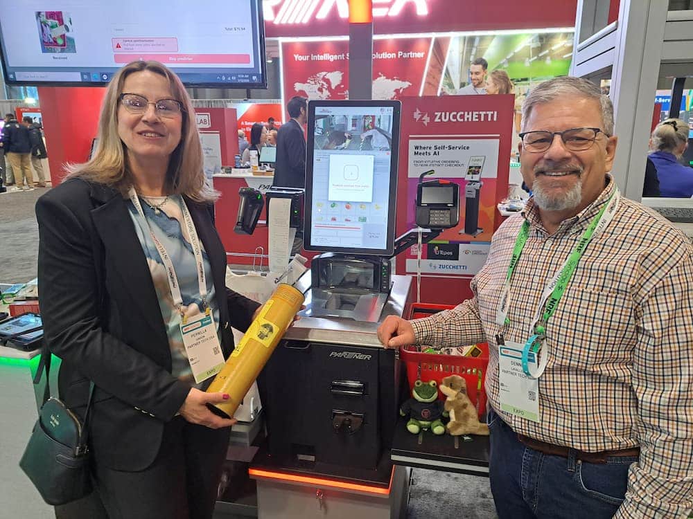 - Pernilla Gibson of Partner Tech and Dennis Lavallee of CK Systems introduce features for a self checkout kiosk including an ADA compliant keypad.