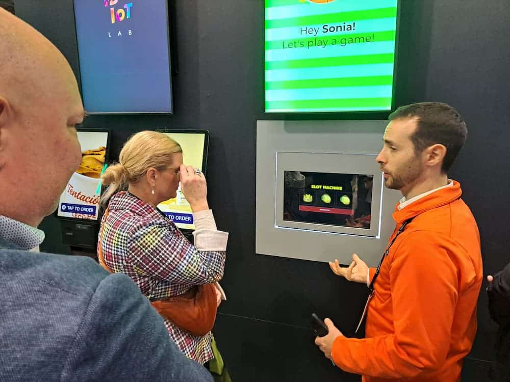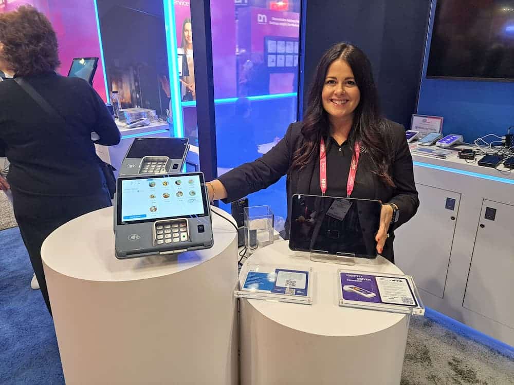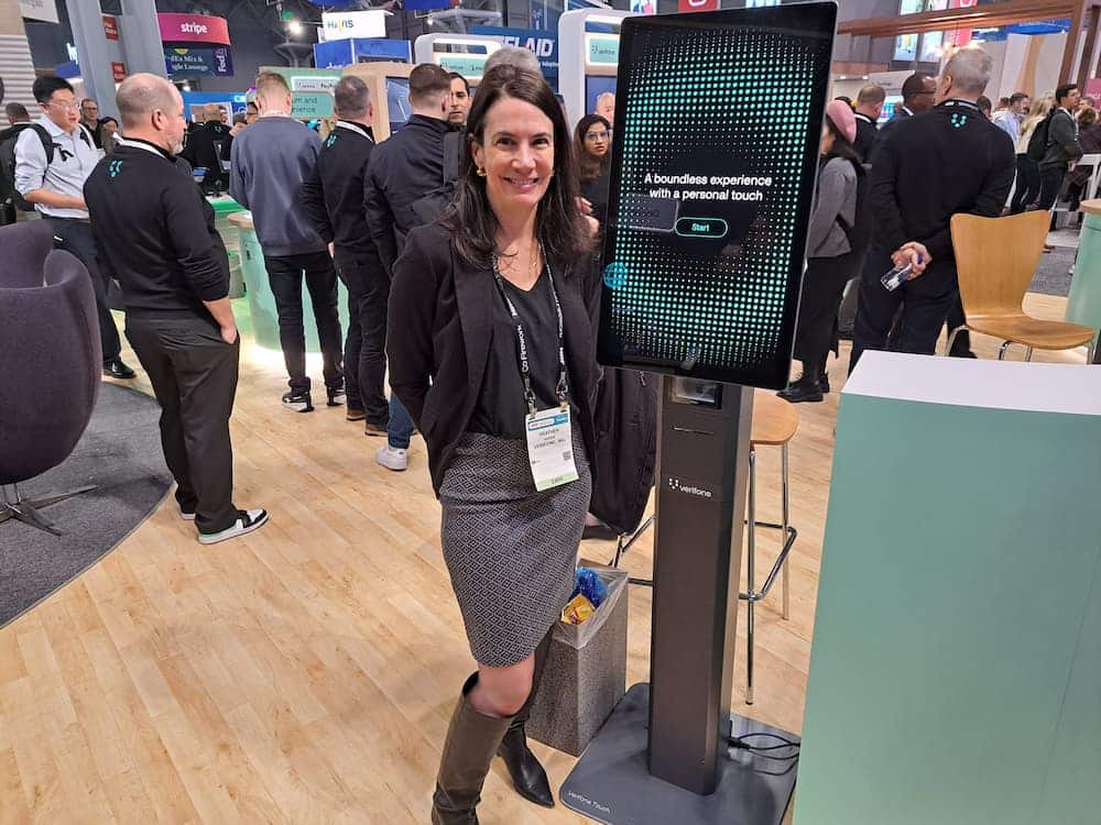 - Heather Hooks shows a prototype of a new kiosk at the Verifone exhibit.