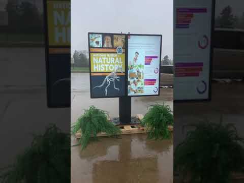 - Outdoor exhibit for a Natural History museum with a two-panel digital menu board. The left screen features museum graphics, while the right displays diverse information. Two potted plants sit at the base, adding greenery to a cloudy day backdrop.