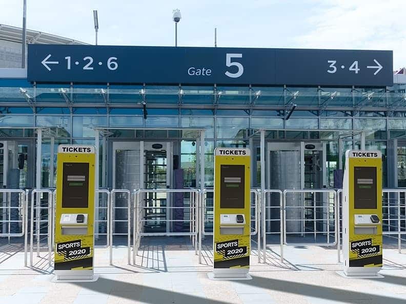 - Ticket kiosks for Sports 2020 stand proudly in front of a glass building entrance at Gate 5, enhanced by sleek digital signage. Overhead signs guide visitors to gates 1-2, 3-4, and 6. The outdoor scene unfolds under clear skies.