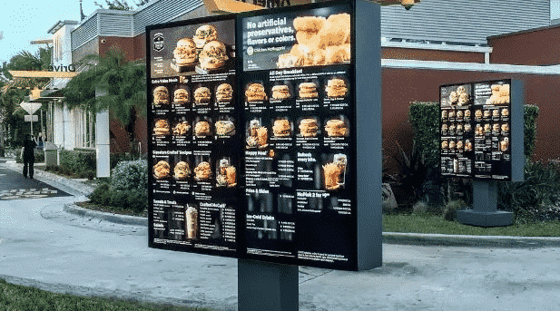 - A fast-food restaurant drive-thru showcases a dynamic menu with digital signage displaying vibrant images and names of burgers, sandwiches, drinks, and meal combos. The sleek kiosk stands outdoors against a backdrop of the building and lush greenery.