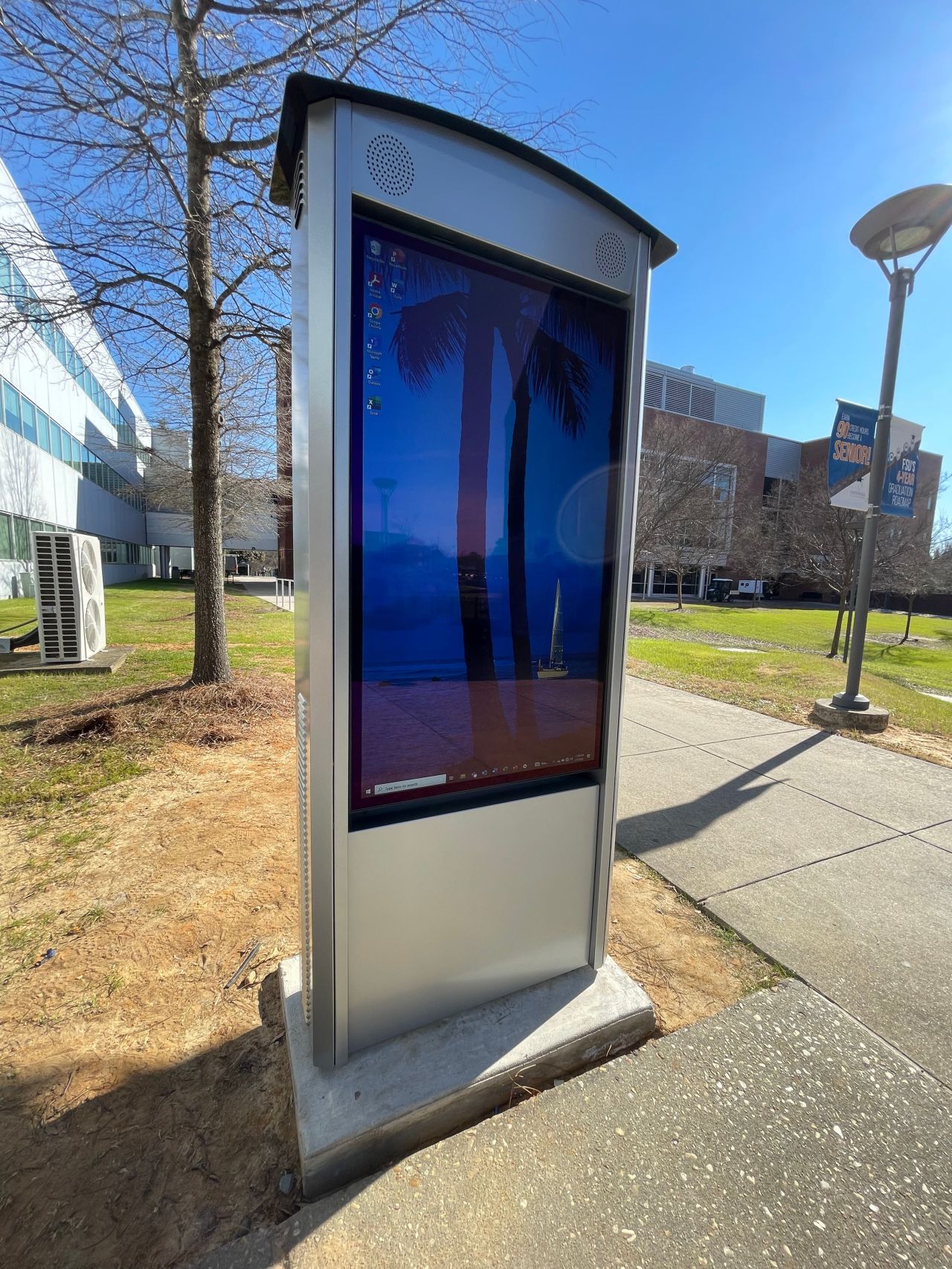 - A digital kiosk from Peerless-AV with a large touchscreen display stands on a grassy area next to a sidewalk. It showcases a beach-themed desktop wallpaper. This Smart City feature enhances the outdoor scene under the clear sky, surrounded by North Carolinas buildings and trees.