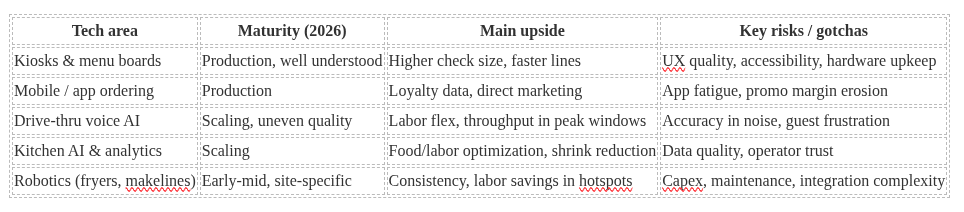- AI at scale: Leading brands (McDonald’s, Yum Brands affiliates) are integrating AI deeper into drive‑thru, order accuracy systems, and broader operational functions.