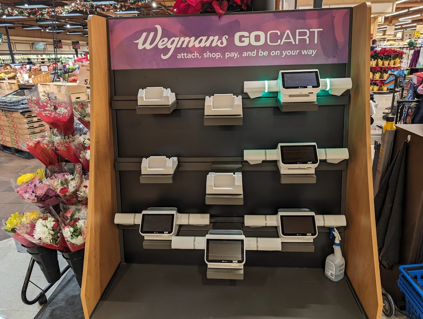 - You attach to cart and just place the items in the cart. At the end a clerk helps with payment
