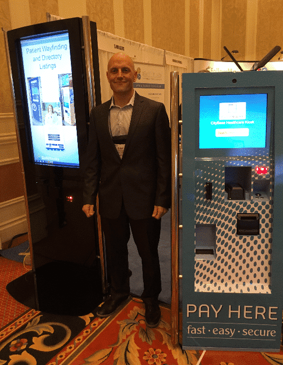 - A person in a suit stands smiling next to two healthcare kiosks. The left one displays Patient Wayfinding and Directory Listings, while the right is labeled PAY HERE with fast • easy • secure beneath. Theyre in a bustling conference setting.