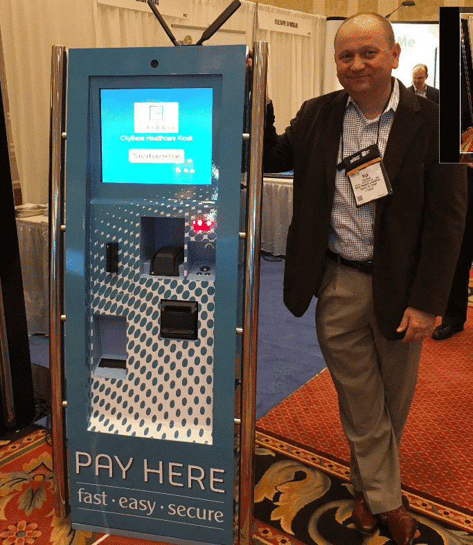 - A man stands smiling beside a blue healthcare kiosk labeled PAY HERE, fast · easy · secure. The kiosks screen reads CityBase Healthcare Kiosk and features a card reader. In the background, theres a patterned carpet and a conference booth setup, highlighting the innovative healthcare solution.