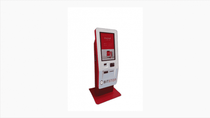 - A row of red and white kiosks with large screens and card readers, branded with Bitstop. These machines are likely used for cryptocurrency transactions.