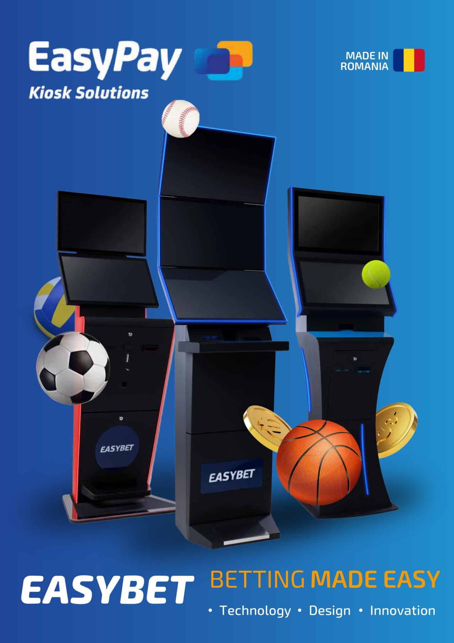 - Three EasyPay self-service sports betting kiosks are shown, surrounded by sports balls and gold coins on a blue background. The text reads EasyPay Kiosk Solutions and EasyBet Betting Made Easy. Romanian flag and logo are visible.