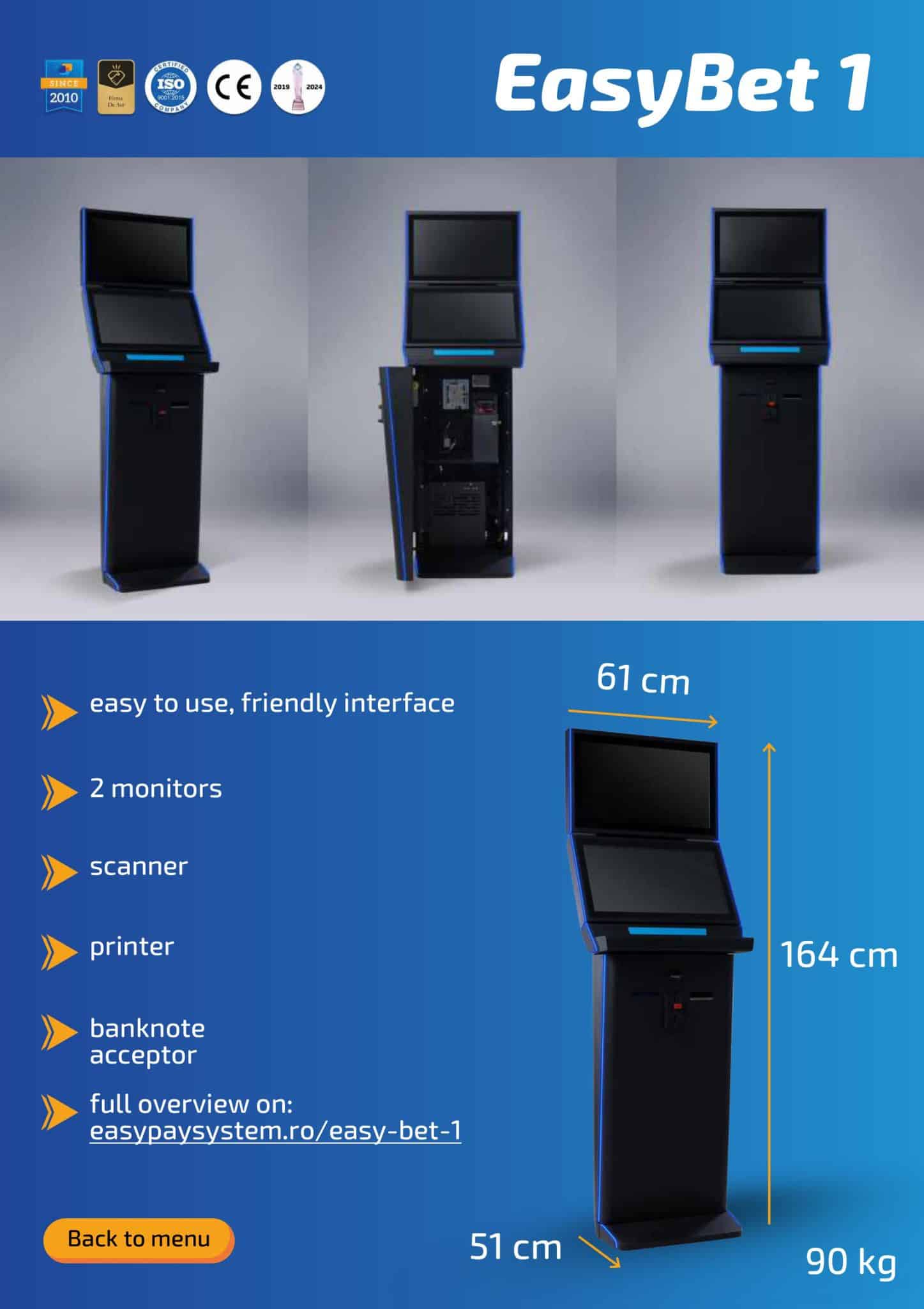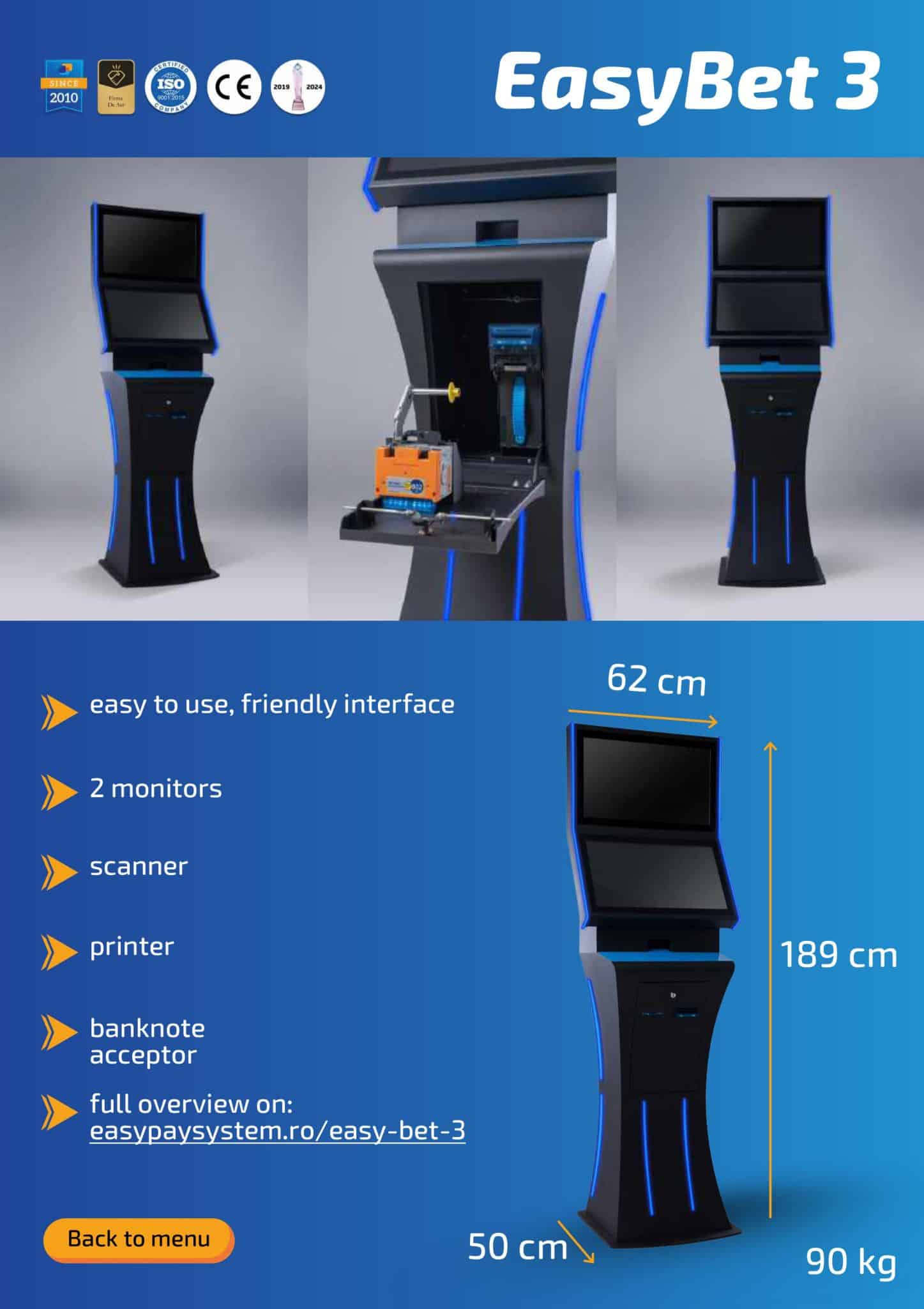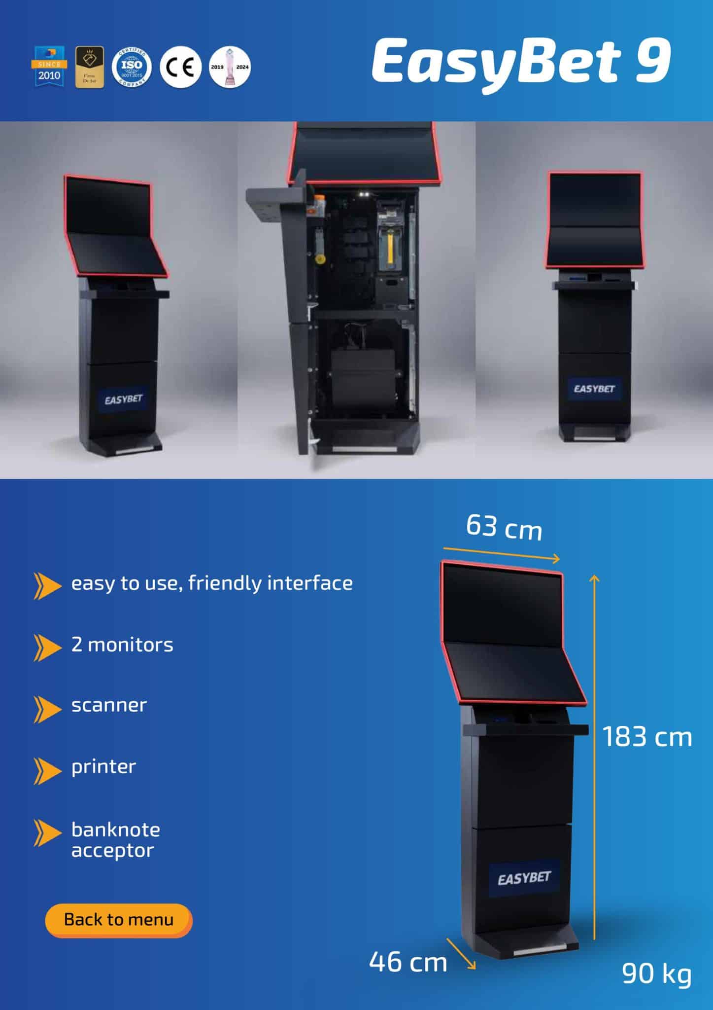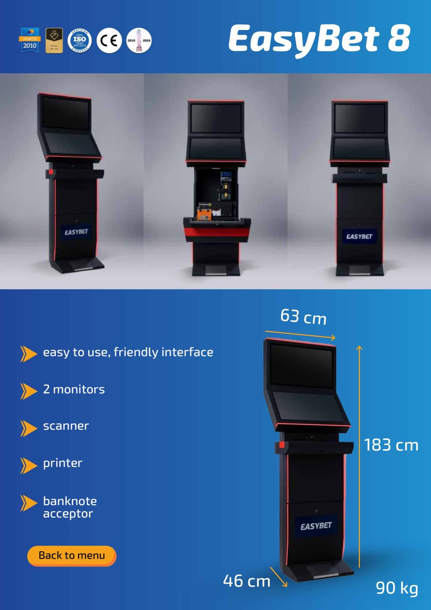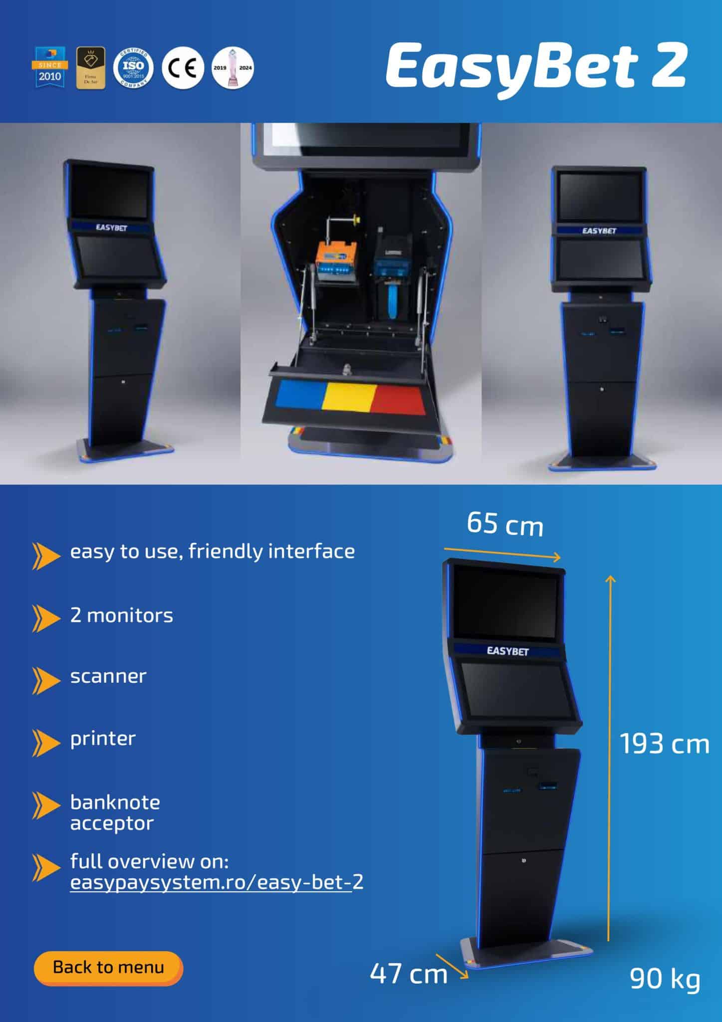 - EasyBet 2 sports betting kiosk by EasyPay features two monitors, scanner, printer, and banknote acceptor. Measuring 193 cm x 65 cm x 47 cm and weighing 90 kg, it offers intuitive icons and a highlighted Back to menu button.
