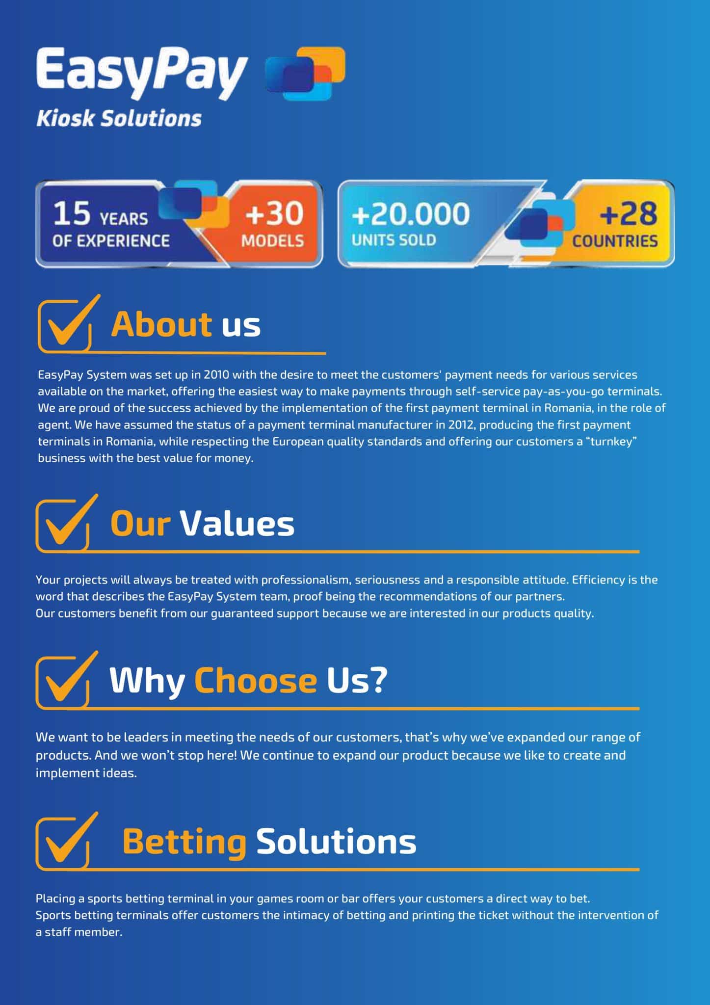 - An infographic for EasyPay Kiosk Solutions showcases company highlights: 15+ years of experience, 30+ models, 20,000+ units sold, and a presence in 28+ countries. It features company info, values, reasons to choose them, and sports betting kiosk solutions.