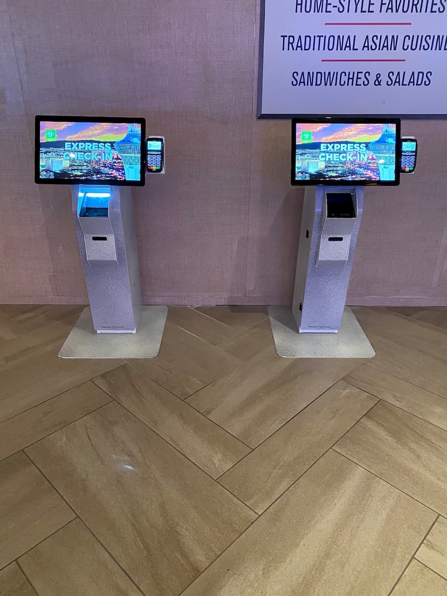 - Two self-service kiosks for ticketing and check-in, equipped with screens and card readers, stand on a wooden floor against a beige wall. A sign above highlights various cuisines, including home-style and traditional Asian dishes, sandwiches, and salads.