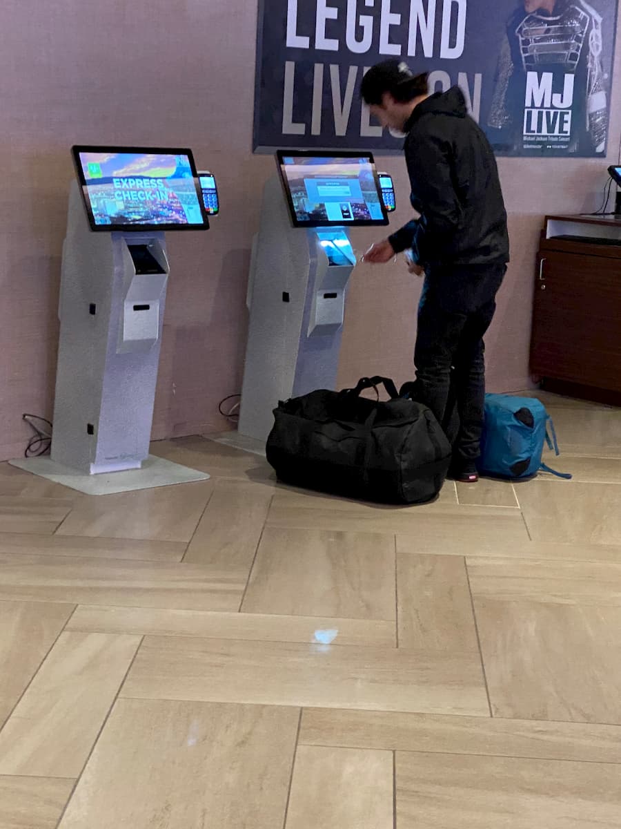 - A person uses a ticketing and check-in kiosk at a hotel or event venue. Standing beside two kiosks, they engage with the screen of one unit, while two large bags sit on the floor nearby. In the background, a poster partially reads LEGEND.