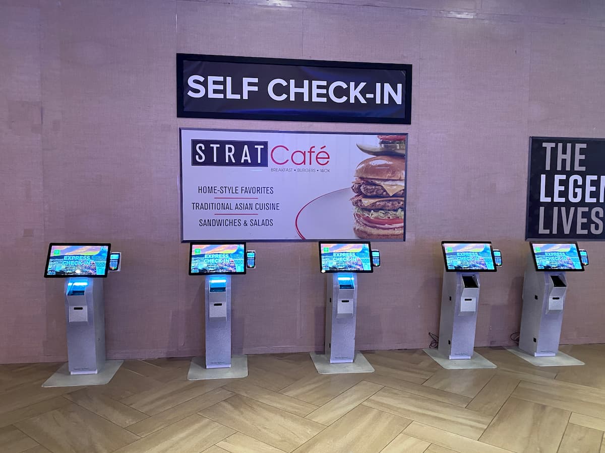 - A row of six ticketing and check-in kiosks is lined up against a wall. Above them, signs read SELF CHECK-IN and STRAT Café, offering homestyle favorites, traditional Asian cuisine, sandwiches, and salads.