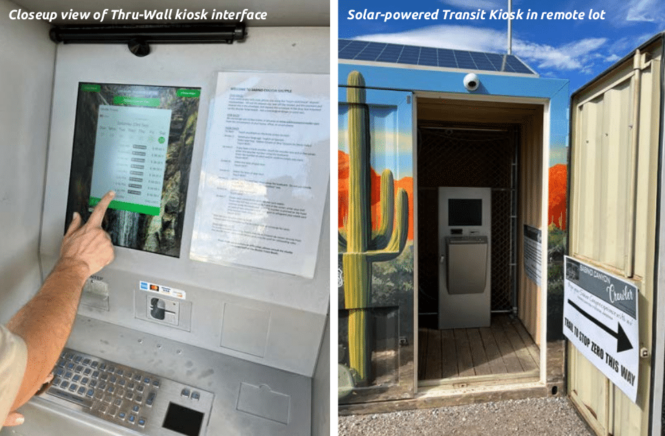 - Left image: A person engaging with an outdoor through-wall kiosk interface via touchscreen. Right image: A solar-powered ticketing kiosk in a remote lot, featuring a keypad and monitor inside, adorned with desert landscape artwork.