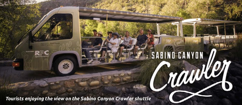 recreation area for both residents and visitors alike. The area has been closed to private vehicles since 1978, but visitors can tour the canyon via the emission-free, open-air Sabino Canyon Crawler. The 1-hour round trip features an audio tour where passengers can plug provided earbuds in at their seat, providing a unique experience for those on the tour while shielding non-shuttle canyon visitors from noise and sounds. The narration is available in English and Spanish. The shuttle system features five Sabino Canyon Crawlers, each with seating space for up to 62 passengers.