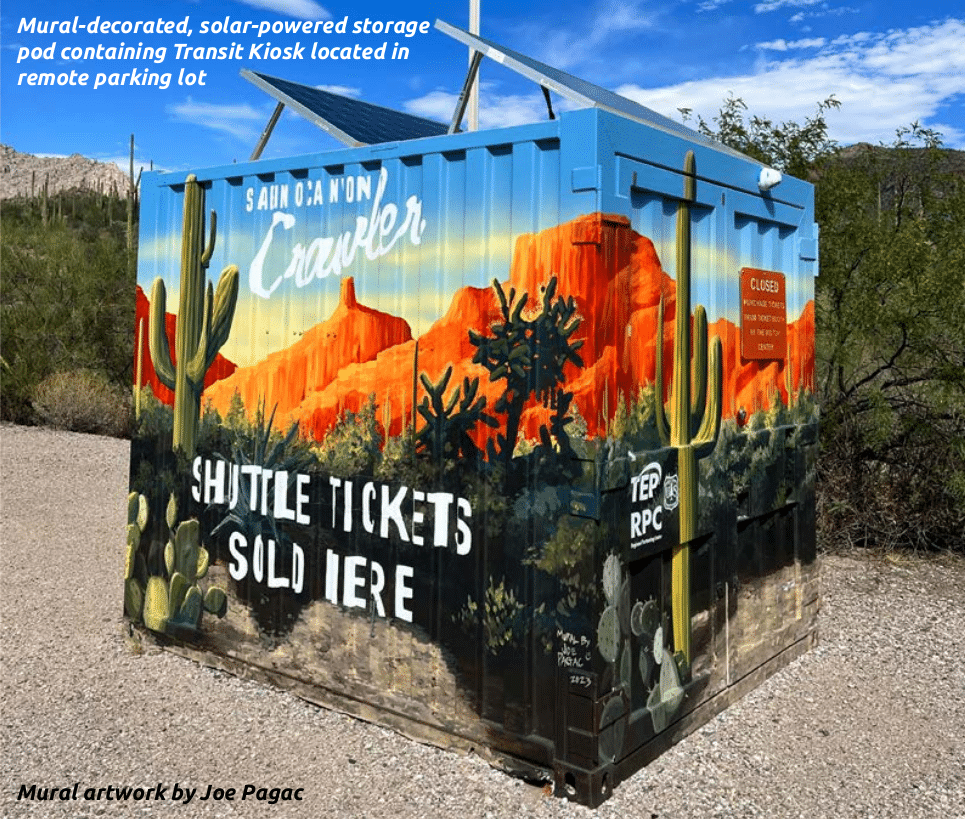 One of the standalone kiosks is located inside the Sabino Canyon gift shop. The other is stationed inside in a mural-decorated, solar powered storage pod located in a remote parking lot, serving visitors during the area’s busy season.