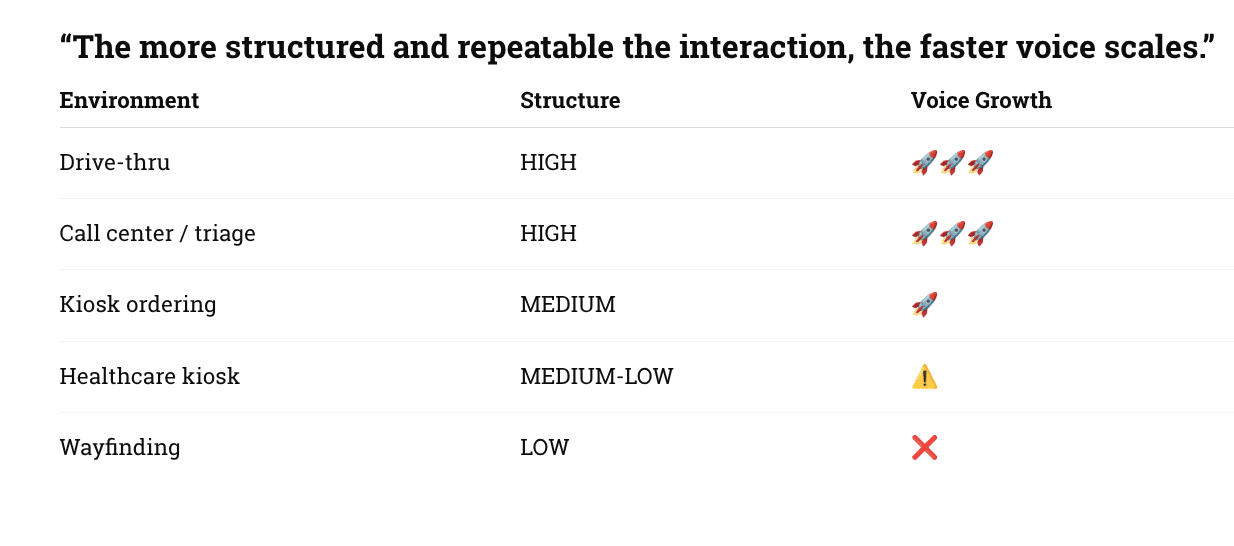 Drive-thru is the only environment where voice is becoming the primary interface, while enterprise and healthcare are rapidly shifting voice to the “front door” for triage and routing.