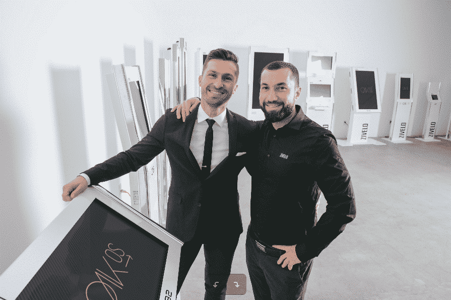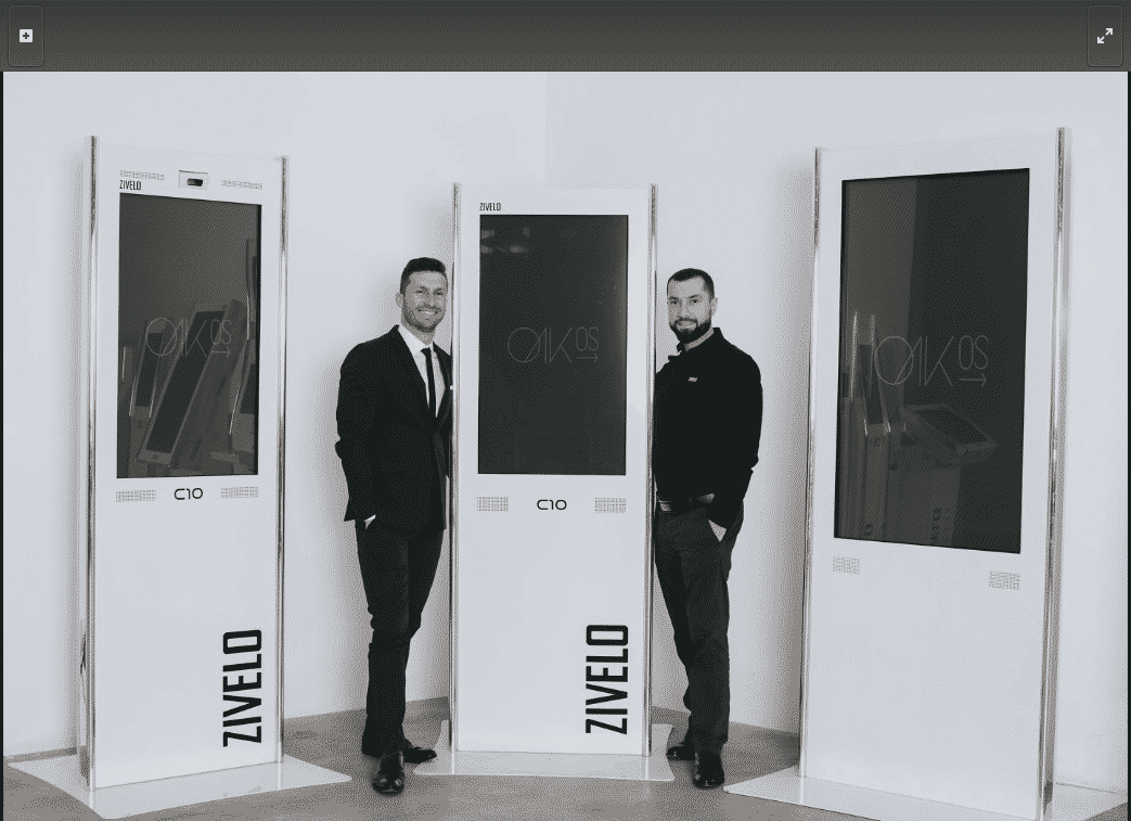 - Two men stand smiling between three tall ZIVELO kiosks labeled OAKOS. Dressed in formal attire, they appear to be in a showroom or office space. The kiosks feature large screens prominently displaying the name OVKOS, exuding a sleek and professional atmosphere.